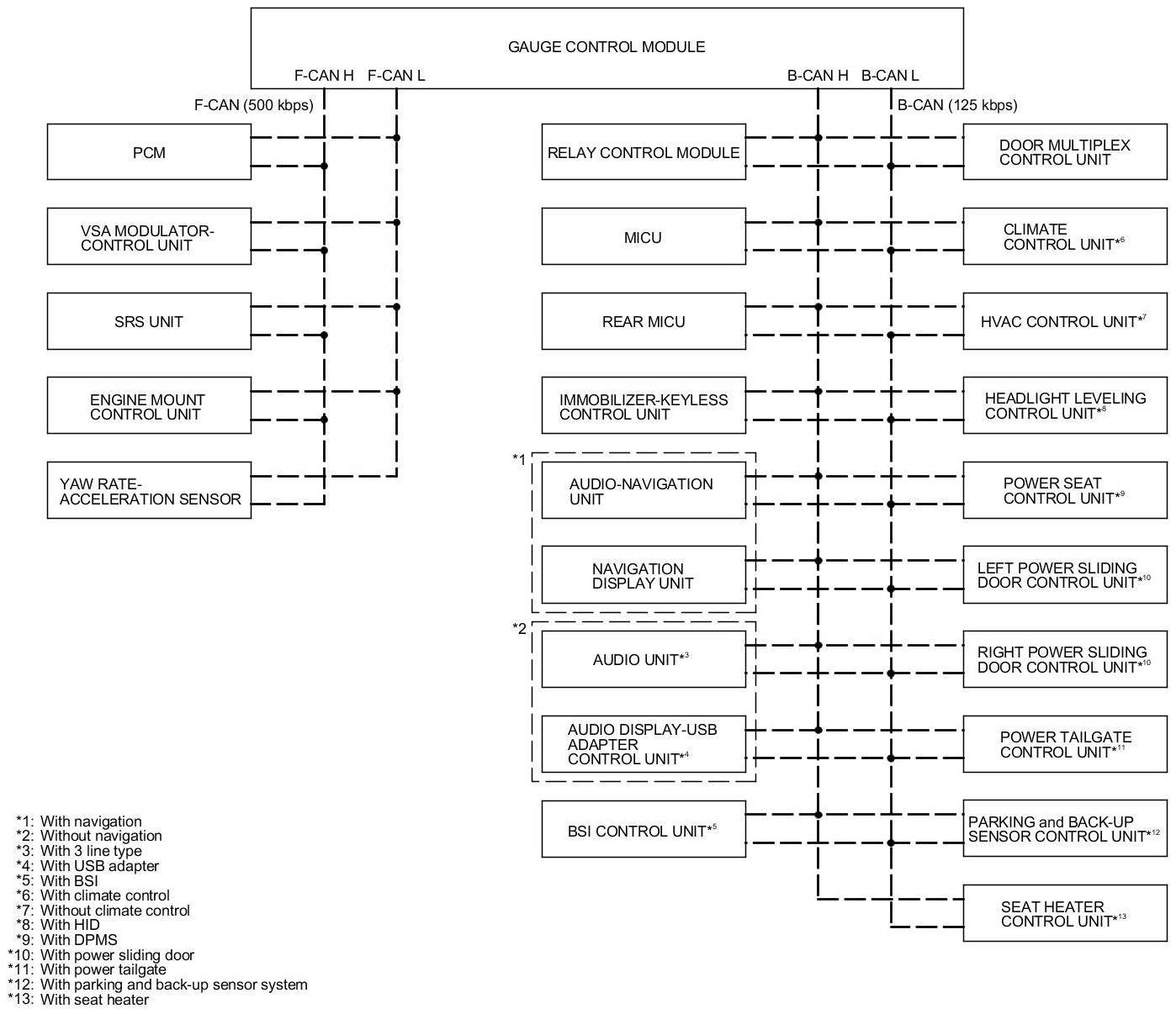 The gauge control module acts as a gateway to allow both systems to share information. The gauge control module translates and relays the information from B-CAN to F-CAN and from F-CAN to B-CAN.