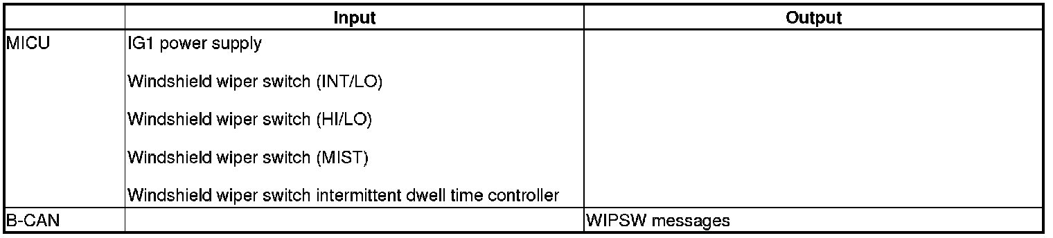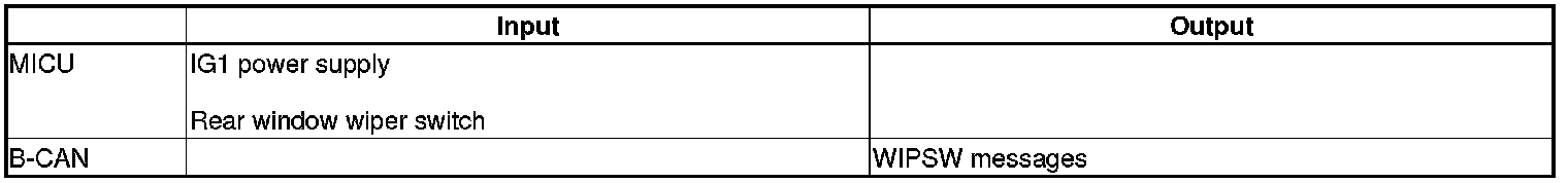 The rear MICU controls the rear window wiper motor and washer motor based on inputs from each switch and B-CAN data.