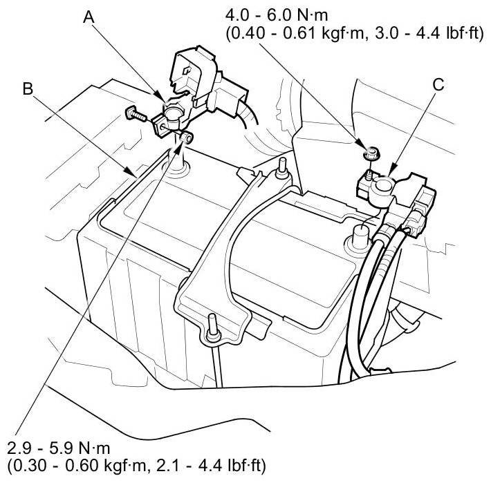 3. Reconnect the positive cable (A) to the battery (B) first, then reconnect the negative cable (C) to the battery.