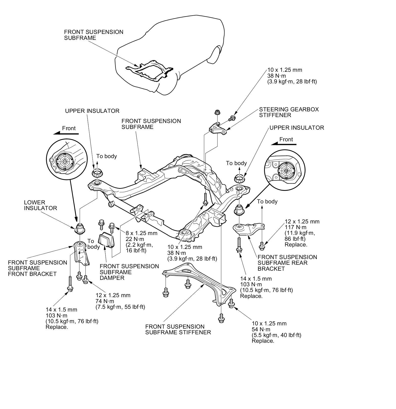 - After removing the subframe mounting bolts, be sure to replace them with new ones.
