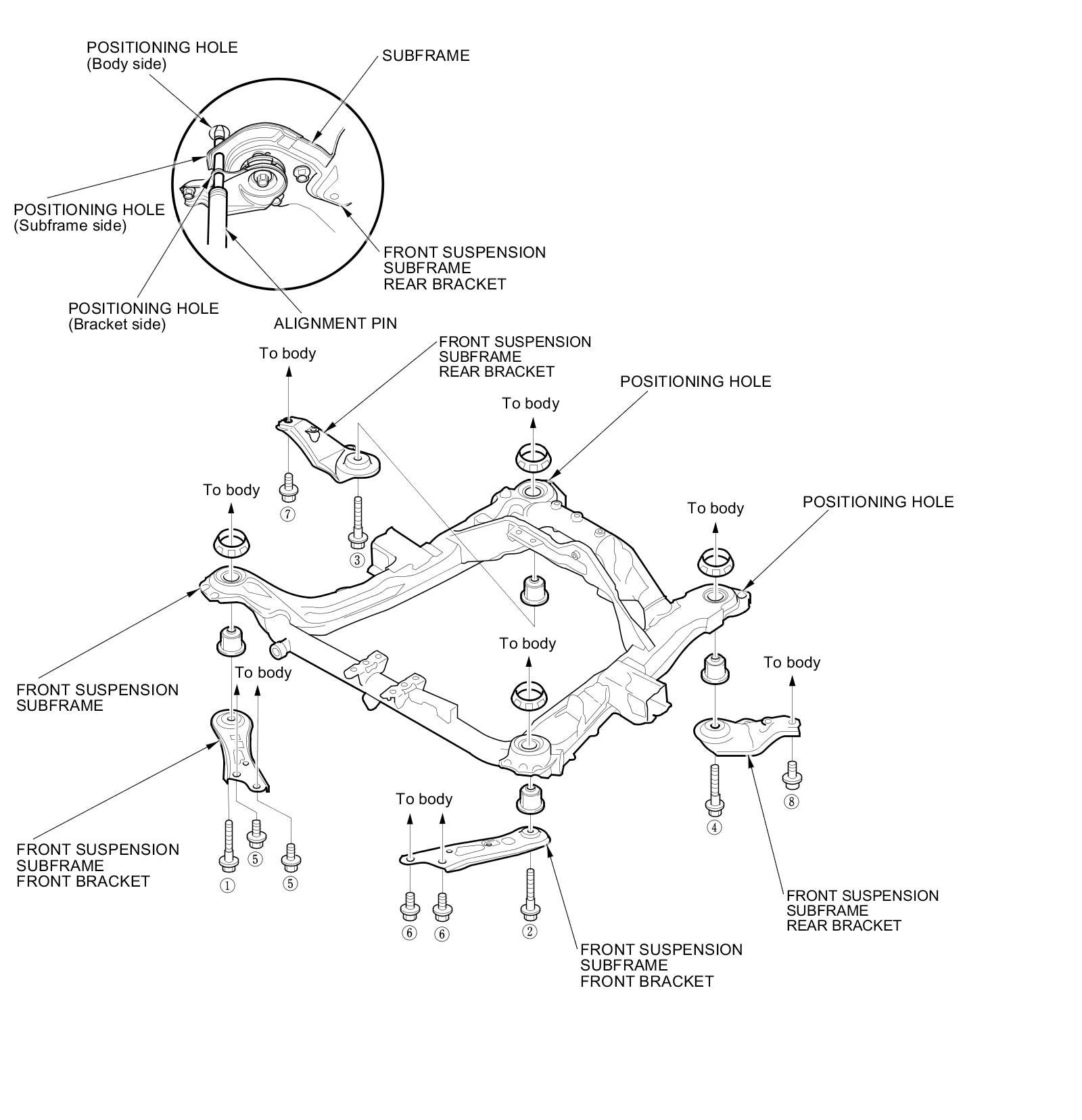 - After mounting the subframe and brackets loosely, align all of the positioning holes in the subframe, the subframe front bracket, and in the body using a alignment pin as a guide, then tighten the bolts.