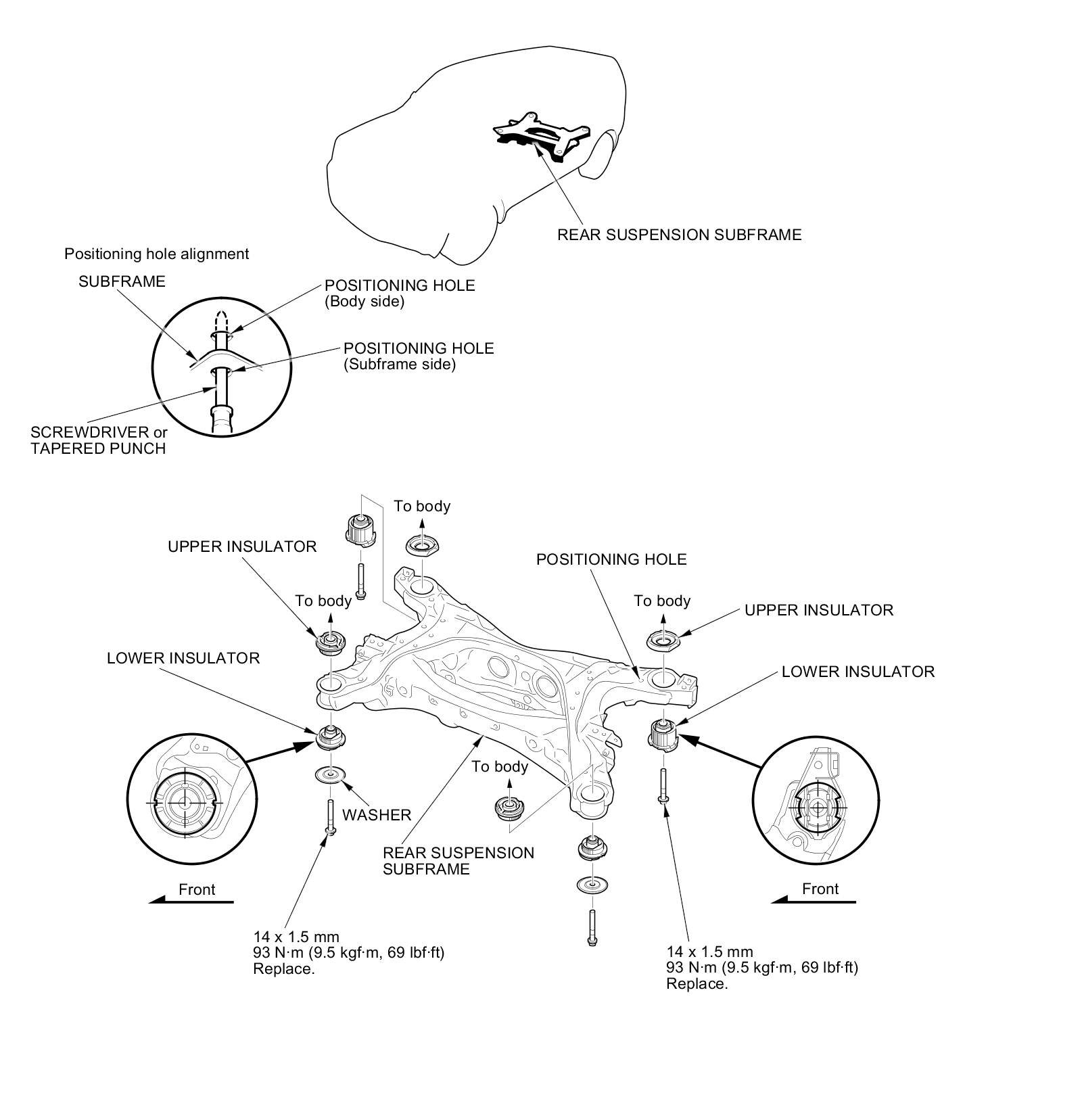 - When installing, align both positioning holes in the subframe with the positioning holes in the body using a screwdriver or tapered punch as a guide.