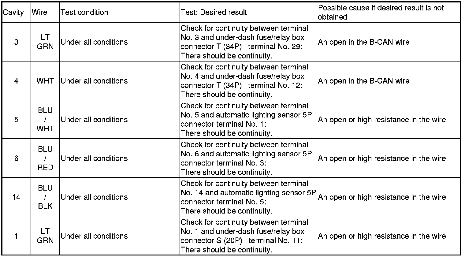 - If all the input tests prove OK, replace the automatic lighting control unit.