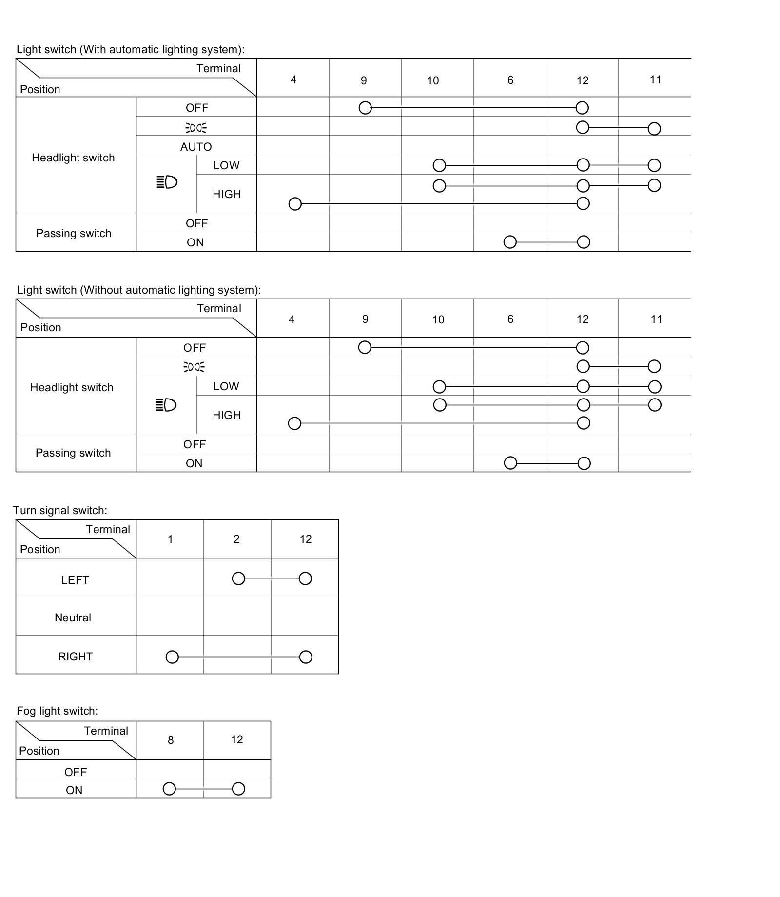 - If the terminals look OK, check for continuity between the terminals in each switch position according to the tables.