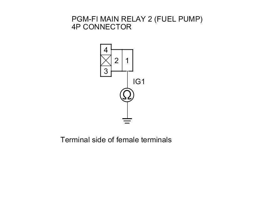 48. Check for continuity between PGM-FI main relay 2 (FUEL PUMP) 4P connector terminal No. 1 and body ground.