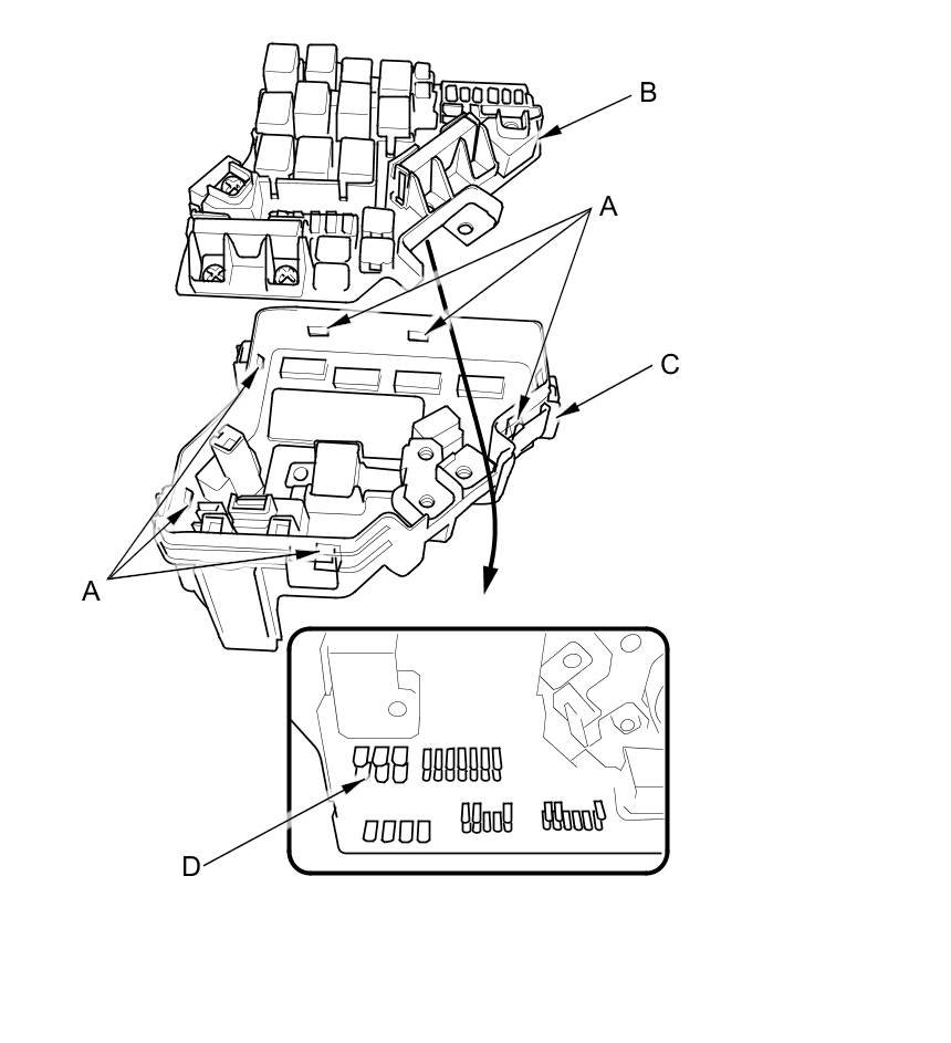 4. Turn the housing over again. Using two flat-tip screwdrivers, release the tabs (A), and pry up the fuse/relay box base (B) from the fuse/relay box housing (C).