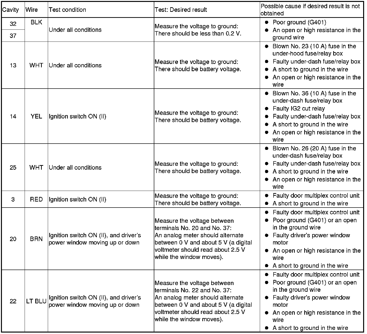 4. With the door multiplex control unit 37P connector still disconnected from the power window master switch, do the following input tests.
