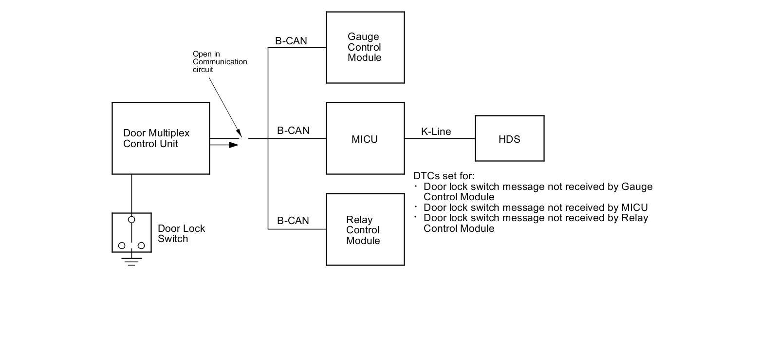 - The multiplex integrated control unit (MICU), relay control module, and gauge control module expect to receive the door lock switch message, but since there is a break in the communication circuits, it is not received.