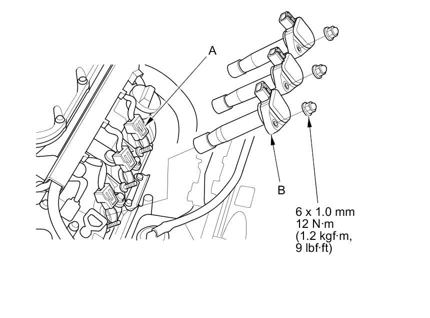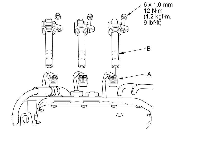 2. Disconnect the ignition coil connectors (A), then remove the ignition coils (B).