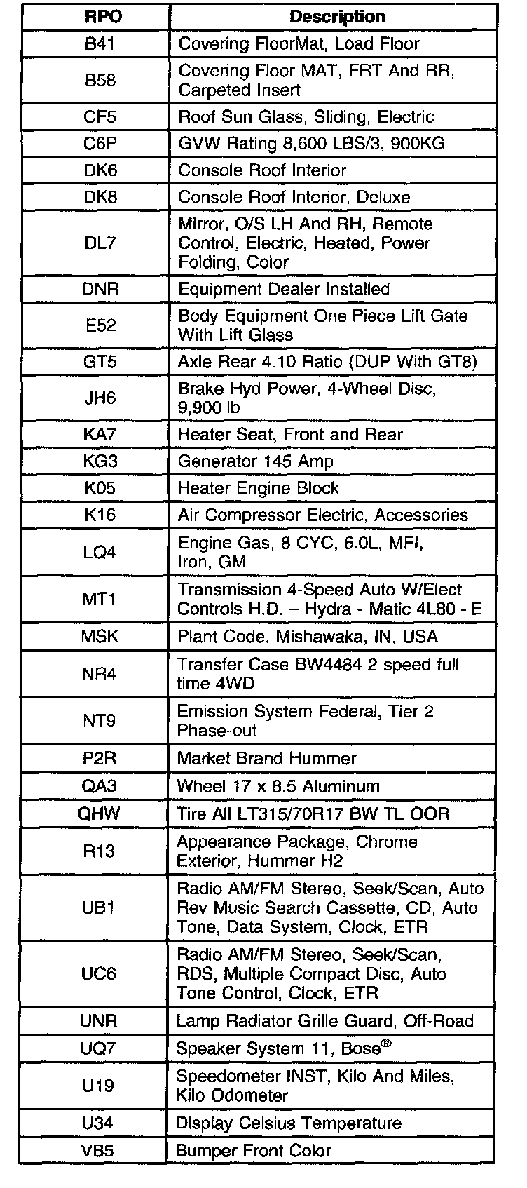 RPO Code List