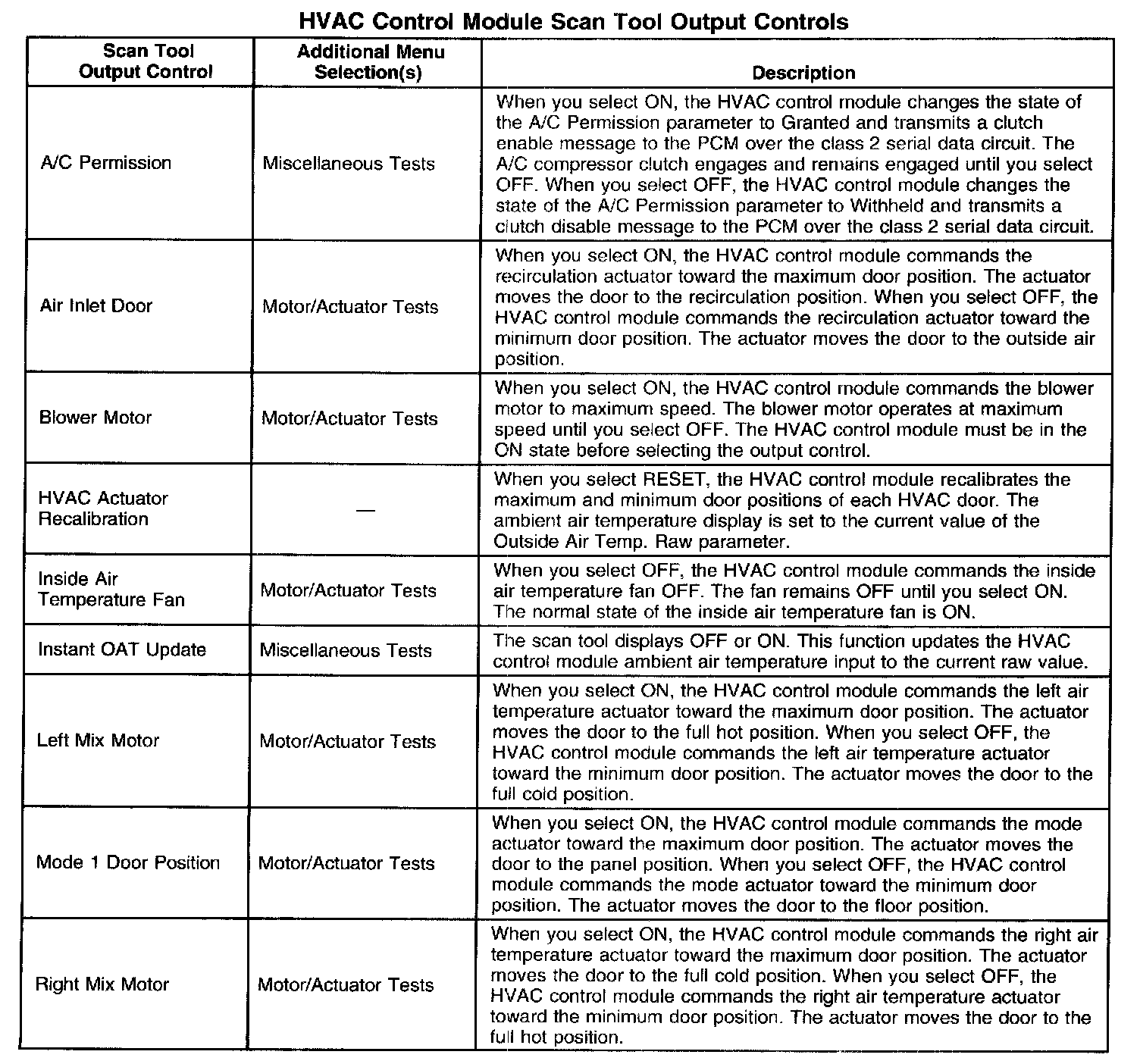HVAC Control Module Scan Tool Output Controls