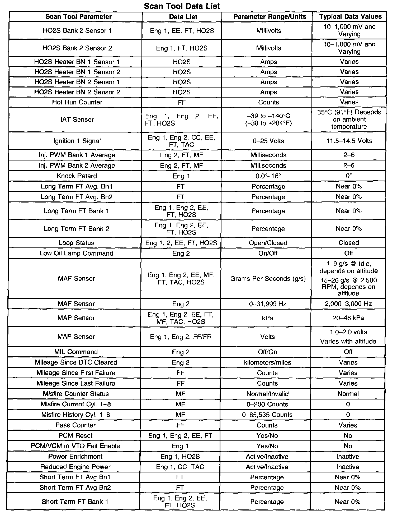 The column labeled Data List indicates where a parameter can be located on the scan tool Refer to the scan tool operating manual for the exact locations of the data lists. The following is a description of each term listed: