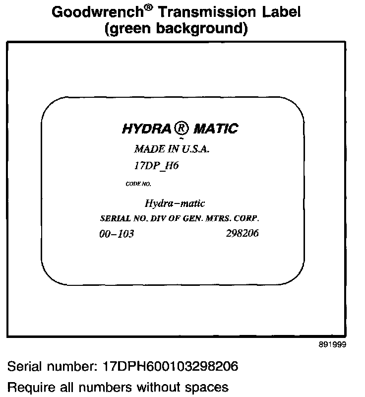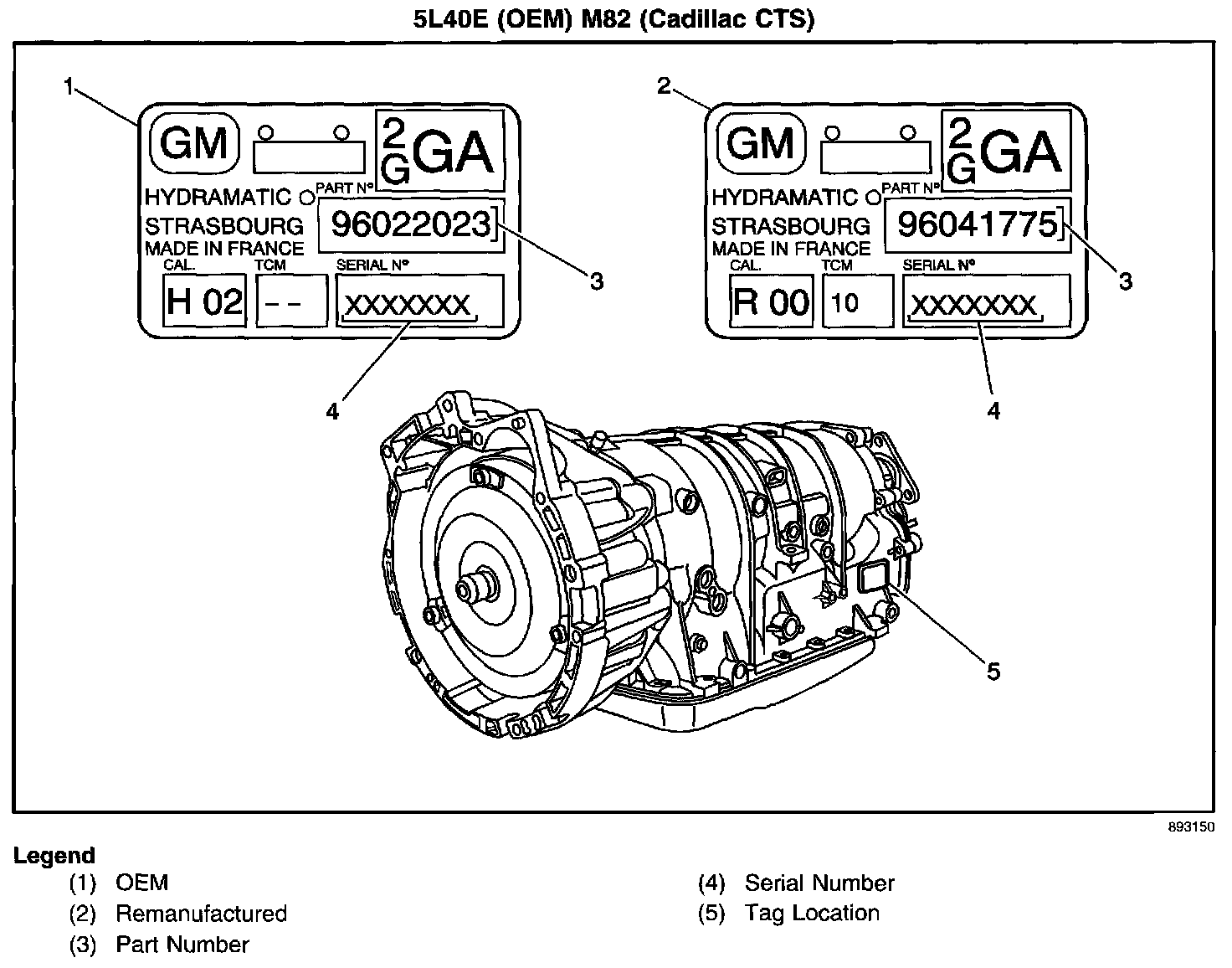 The Allison(R) built transmissions, as well as the 4L30E (Catera) and 5L40 (CTS) do not have green REMAN tags. Refer to the appropriate section in this bulletin for each of these transmissions' correct OEM and REMAN serial numbers.