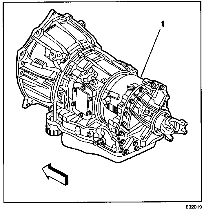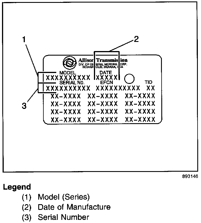 The Allison(R) LCT 1000 automatic transmission ID tag (1) is located on the right (passenger side), just rear of the PTO (power take off) cover.