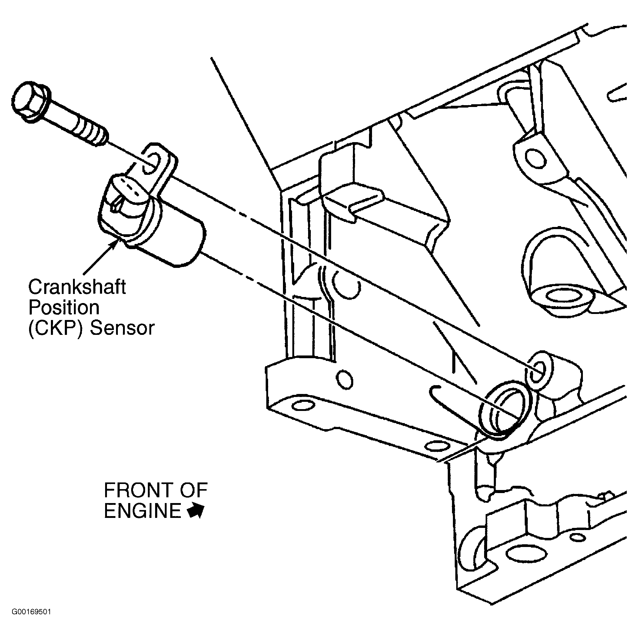 The PCM uses the Crankshaft Position (CKP) sensor to detect crankshaft speed and position. The CKP sensor is located on side of engine block, behind harmonic balancer. See Fig 1. The CKP sensor connects to the PCM through the 12-volt reference circuit, the low reference circuit and CKP sensor 1 signal circuit. If PCM detects that the CKP sensor signal is incorrect for 3 seconds, a DTC will set. To diagnose, perform related diagnostic test. See DIAGNOSTIC TROUBLE CODE DEFINITIONS in SELF-DIAGNOSTICS - 4.8L, 5.3L & 6.0L "C", "K" & "N" SERIES - FLEX FUEL & GASOLINE article.