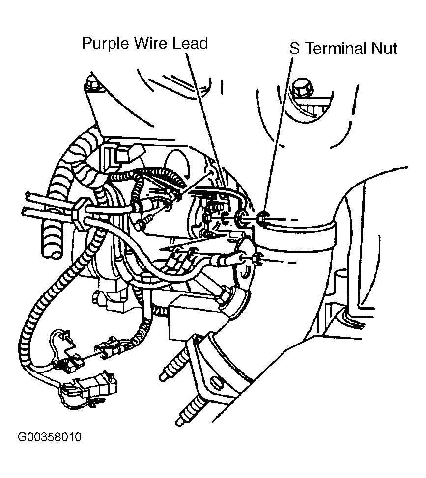- Install the starter motor S terminal washer and purple lead wire. See Figure