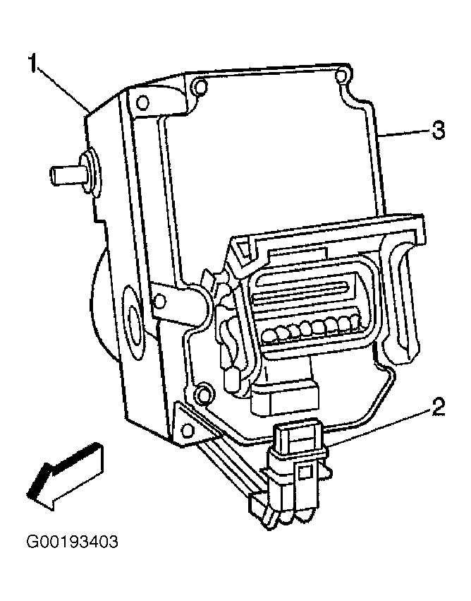 - Raise and support vehicle. Remove driver front wheel. Pull push-in retainers to emove bumper fascia extension. Remove connector position assurance (2) from Electronic Brake Control Module (EBCM) harness connector (1). Ensure ignition switch is in OFF position. Rotate EBCM harness connector tab to unlocked position and disconnect EBCM harness connector (1). See Fig 1.