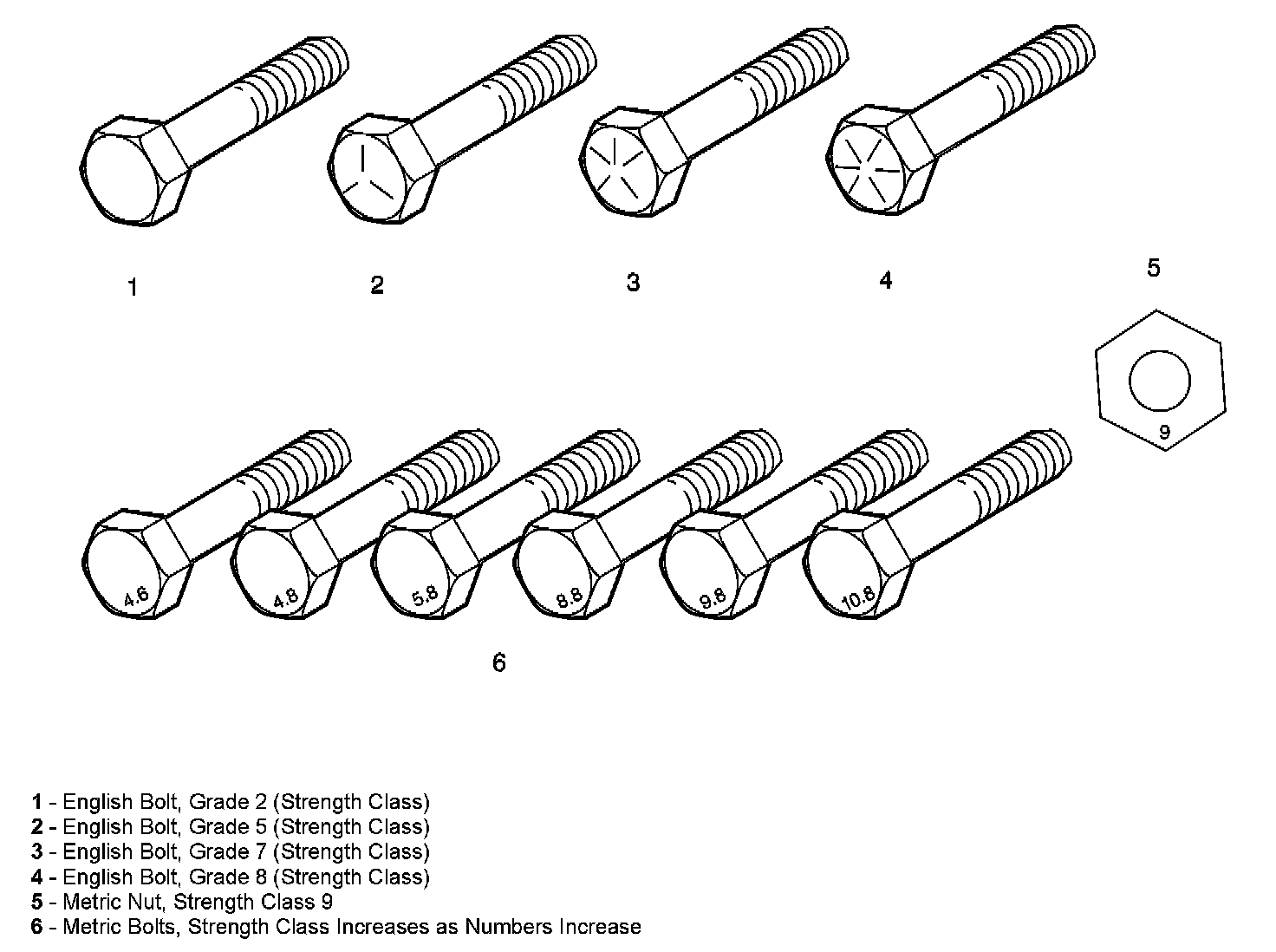 The most commonly used metric fastener strength property classes are 9.8 and 10.9. The class identification is embossed on the head of each bolt. The English, inch strength classes range from grade 2 to grade 8. Radial lines are embossed on the head of each bolt in order to identify the strength class. The number of lines on the head of the bolt is 2 lines less than the actual grade. For example, a grade 8 bolt will have 6 radial lines on the bolt head. Some metric nuts are marked with a single digit strength identification number on the nut face.