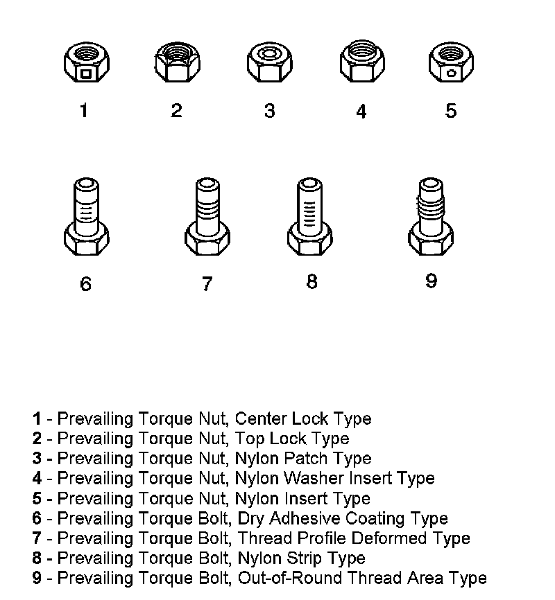 These fasteners accomplish the thread interface by the presence of a thread-locking compound on the fastener threads. Refer to the appropriate repair procedure in order to determine if the fastener may be reused and the applicable thread-locking compound to apply to the fastener.