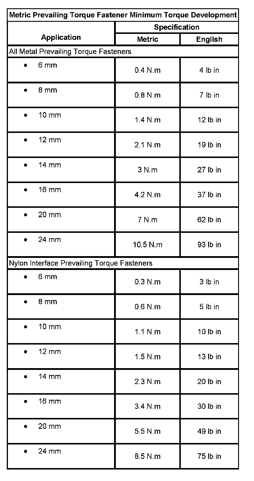 Metric Prevailing Torque Fastener Minimum Torque Development: