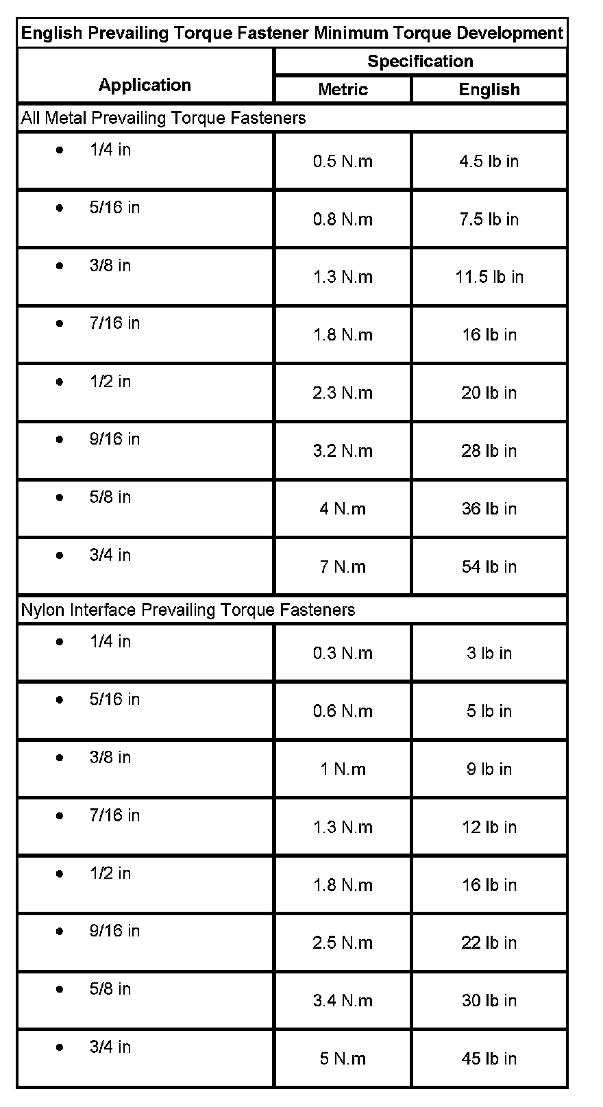 English Prevailing Torque Fastener Minimum Torque Development:
