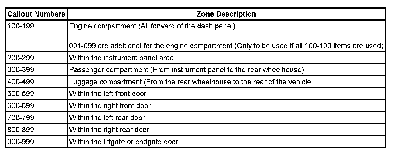 All grounds, in-line connectors, pass-through grommets, and splices have identifying numbers that correspond to where they are located in the vehicle. The table explains the numbering system.