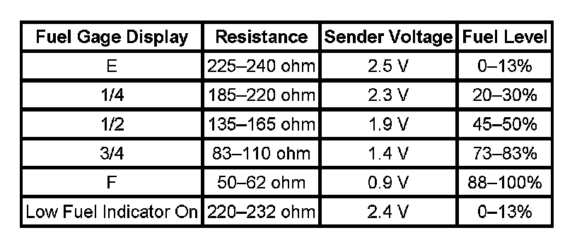 The information in this table is intended for use with the J 33431-C Signal Generator and Instrument Panel Tester. The fuel level sensor values represent the test values to be used on the Signal Generator to drive the fuel gage display to the indicated positions. Vehicles that require more than one fuel level sensor calculate gage position from many possible resistance combinations of fuel levels between the two tanks. Therefore, the values in the table may not correlate directly to readings taken from the vehicle primary or secondary sending units.