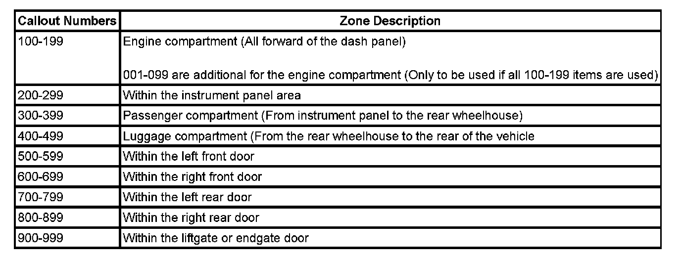 All grounds, in-line connectors, pass-through grommets, and splices have identifying numbers that correspond to where they are located in the vehicle. The following table explains the numbering system.