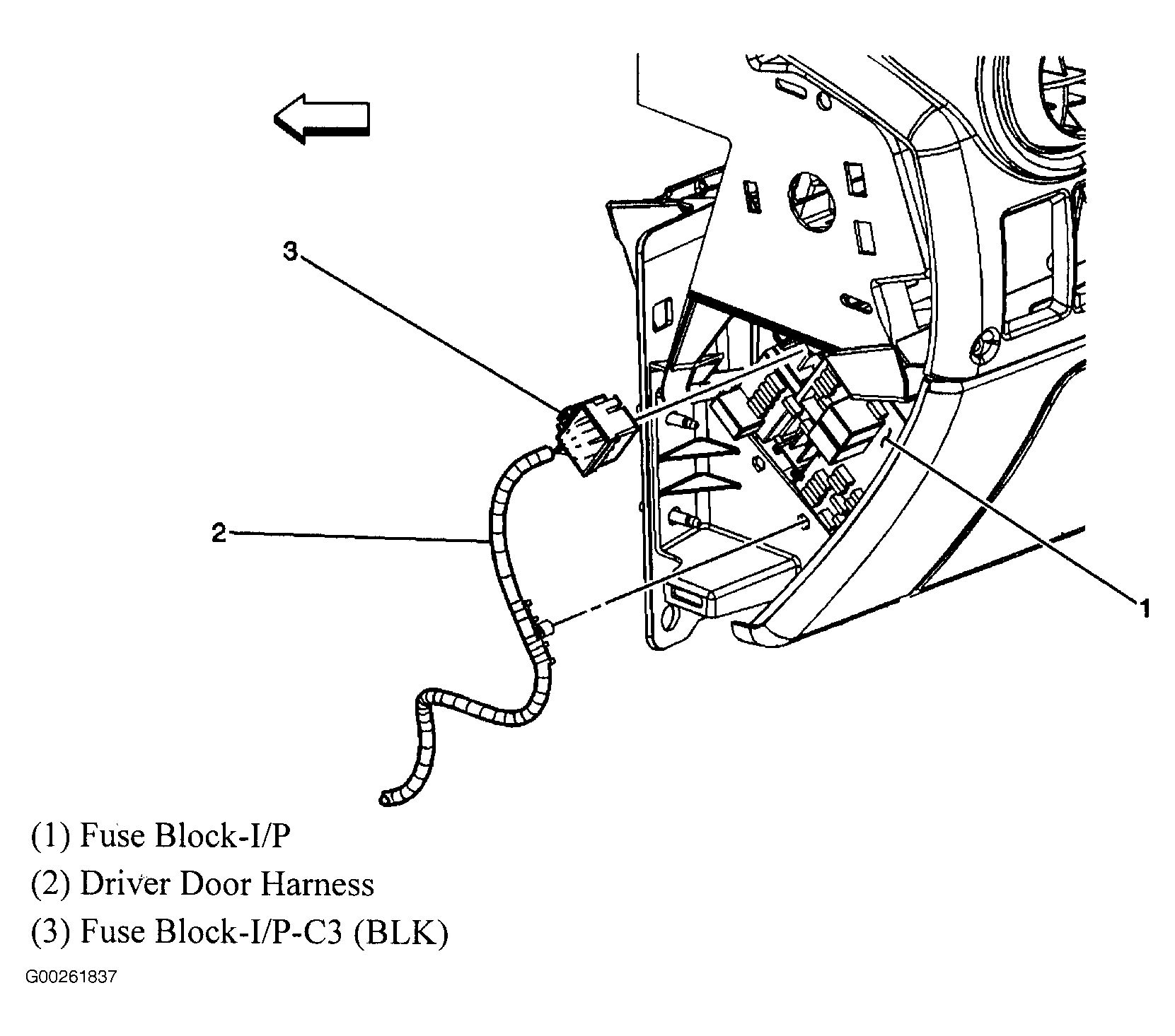 | I/P Fuse Block I/P | On lower left side of dash. See Figure. |