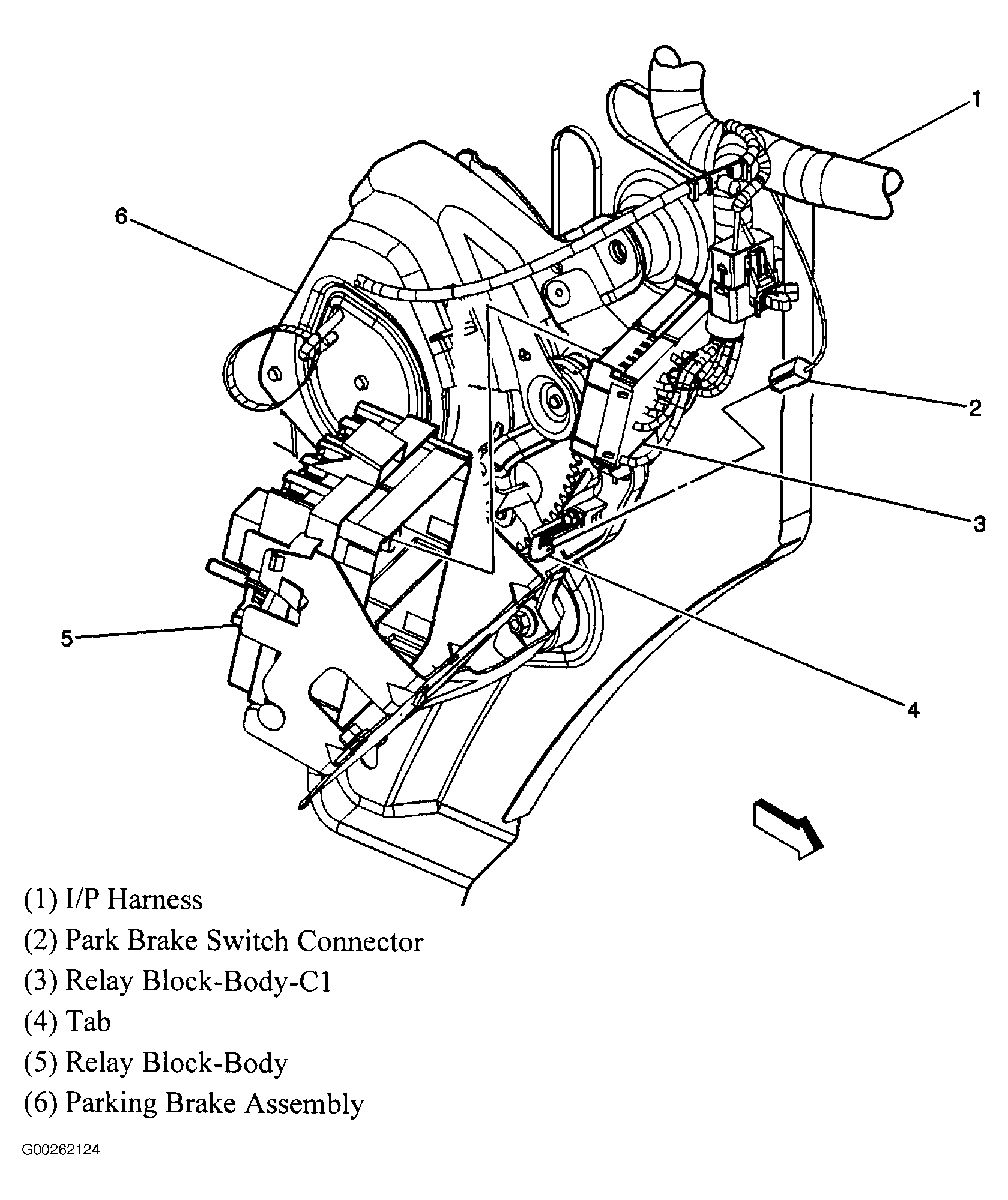 | Body Relay Block | Near parking brake assembly. See Figure. |