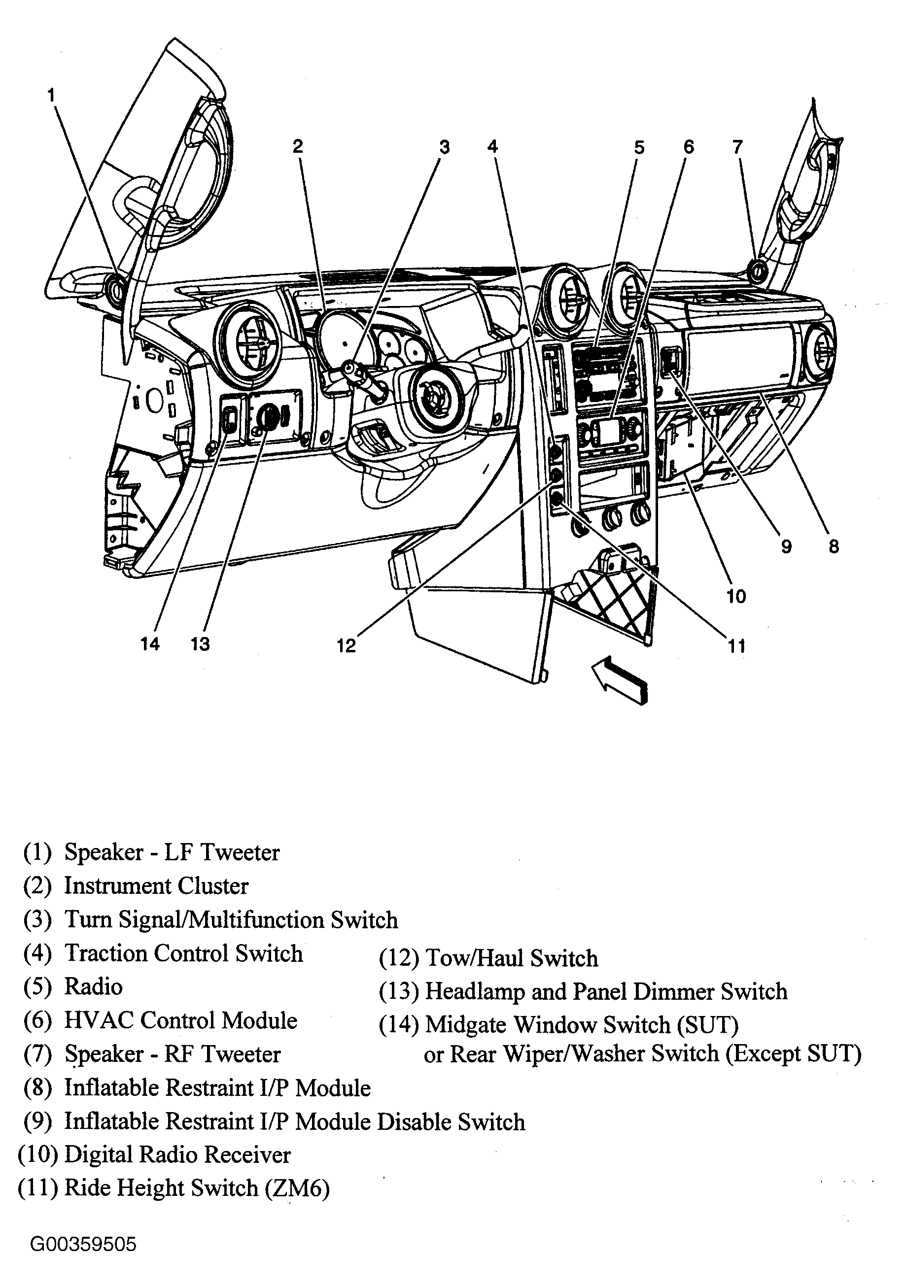 | Inflatable Restraint I/P Module | Behind right side of dash. See Figure. |