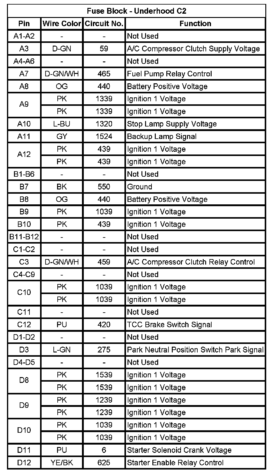 Fuse Block - Underhood C2 (Pin A1 To D12):