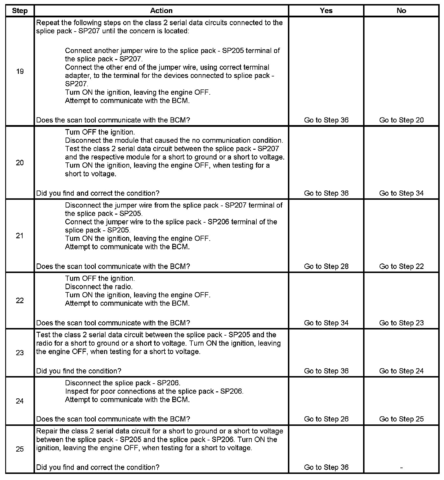 12. The class 2 serial data circuit is shorted to voltage or ground. The condition may be due to the wiring or due to a malfunction in one of the modules. When testing the wire for a short, make sure there is not a module connected to the wire being tested. This test isolates the BCM and the PCM class 2 serial data circuits.