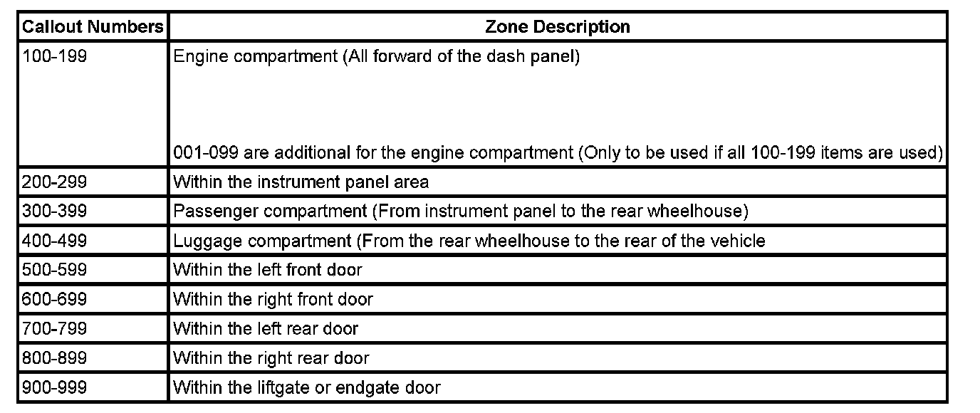 All grounds, in-line connectors, pass-through grommets, and splices have identifying numbers that correspond to where they are located in the vehicle. The following table explains the numbering system.