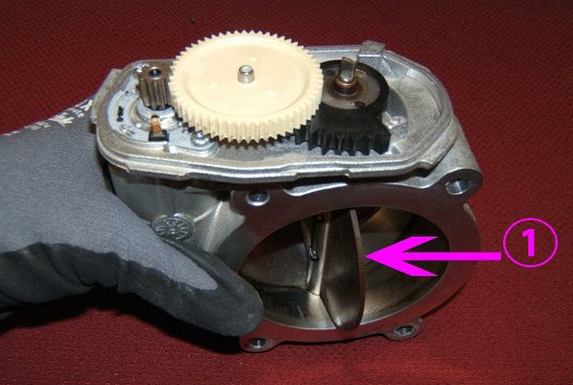 12. Maintain the throttle body in an upward position. Use your thumb to maintain contact with the intermediate gear. => If the intermediate gear falls out and impacts a hard workbench surface or the floor, abort this procedure and REPLACE with a new throttle body assembly.
