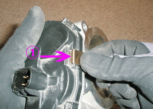 10. Turn over the throttle body and use a flathead screwdriver to remove the four remaining clips from the TP sensor cover. Discard the clips.