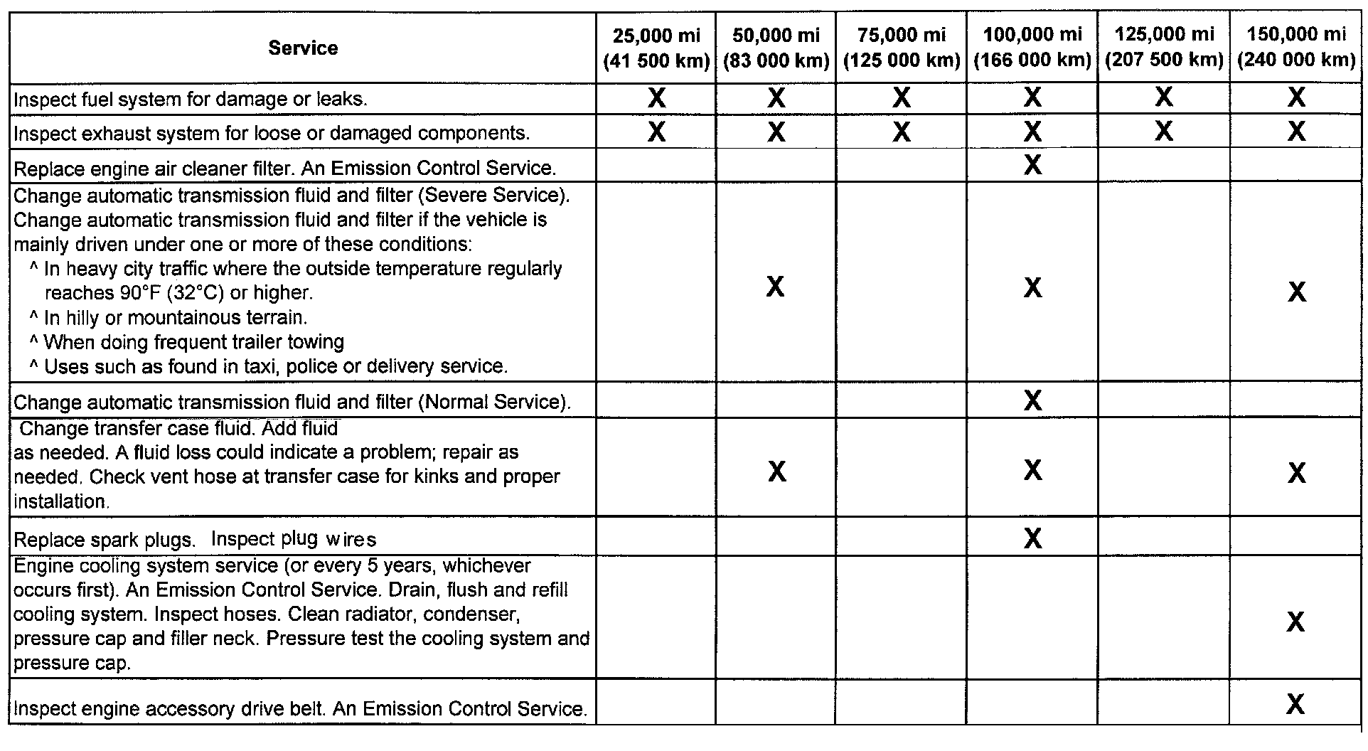 (Maintenance I or Maintenance II) after the indicated kilometers (miles) shown for each item.