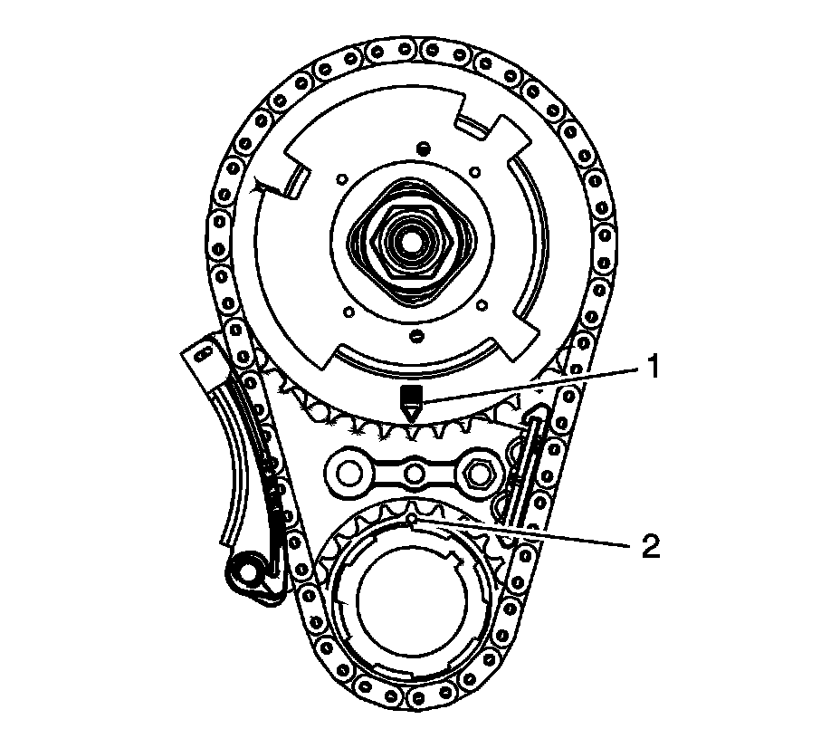 Inspect the sprockets for proper alignment. The mark on the CMP (1) actuator sprocket should be located in the 6 o'clock position and the mark on the crankshaft sprocket (2) should be located in the 12 o'clock position.