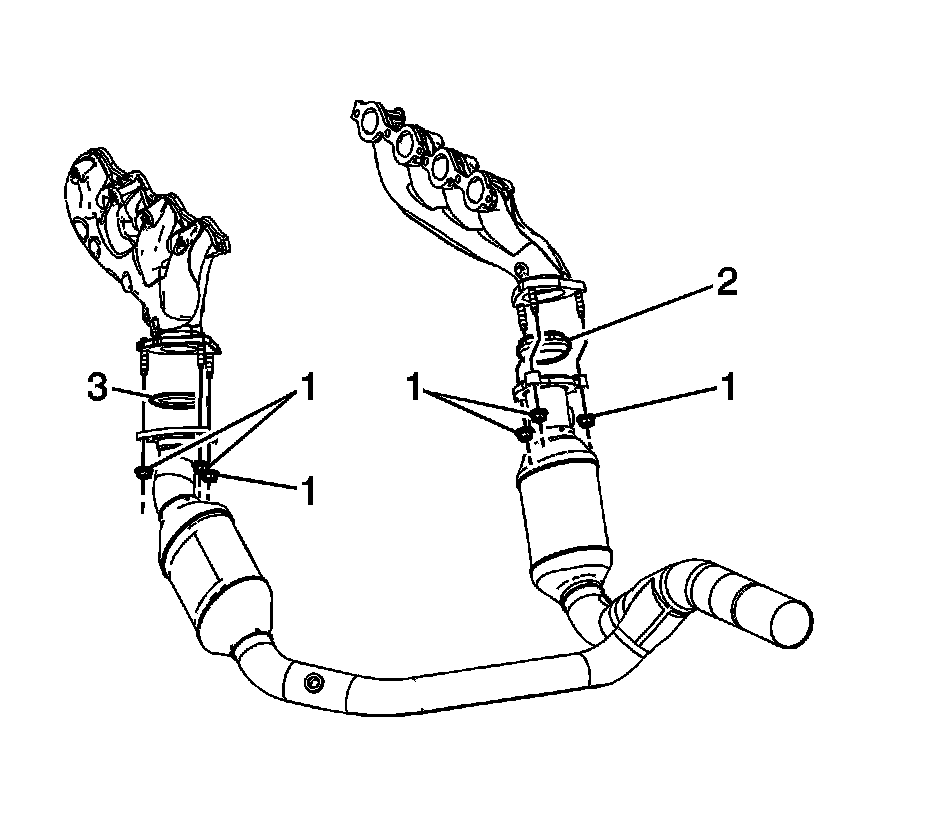 6. If replacing the three way catalytic converter Install the heated oxygen (HO2S) sensors (1 - 5) otherwise Connect the heated oxygen (HO2S) sensors harness connectors. Refer to Heated Oxygen Sensor Replacement - Bank 1 Sensor 1 (Heated Oxygen Sensor Replacement - Bank 1 Sensor 1) , Heated Oxygen Sensor Replacement - Bank 1 Sensor 2 (Heated Oxygen Sensor Replacement - Bank 1 Sensor 2) , Heated Oxygen Sensor Replacement - Bank 2 Sensor 1 (Heated Oxygen Sensor Replacement - Bank 2 Sensor 1) and Heated Oxygen Sensor Replacement - Bank 2 Sensor 2 (Heated Oxygen Sensor Replacement - Bank 2 Sensor 2).