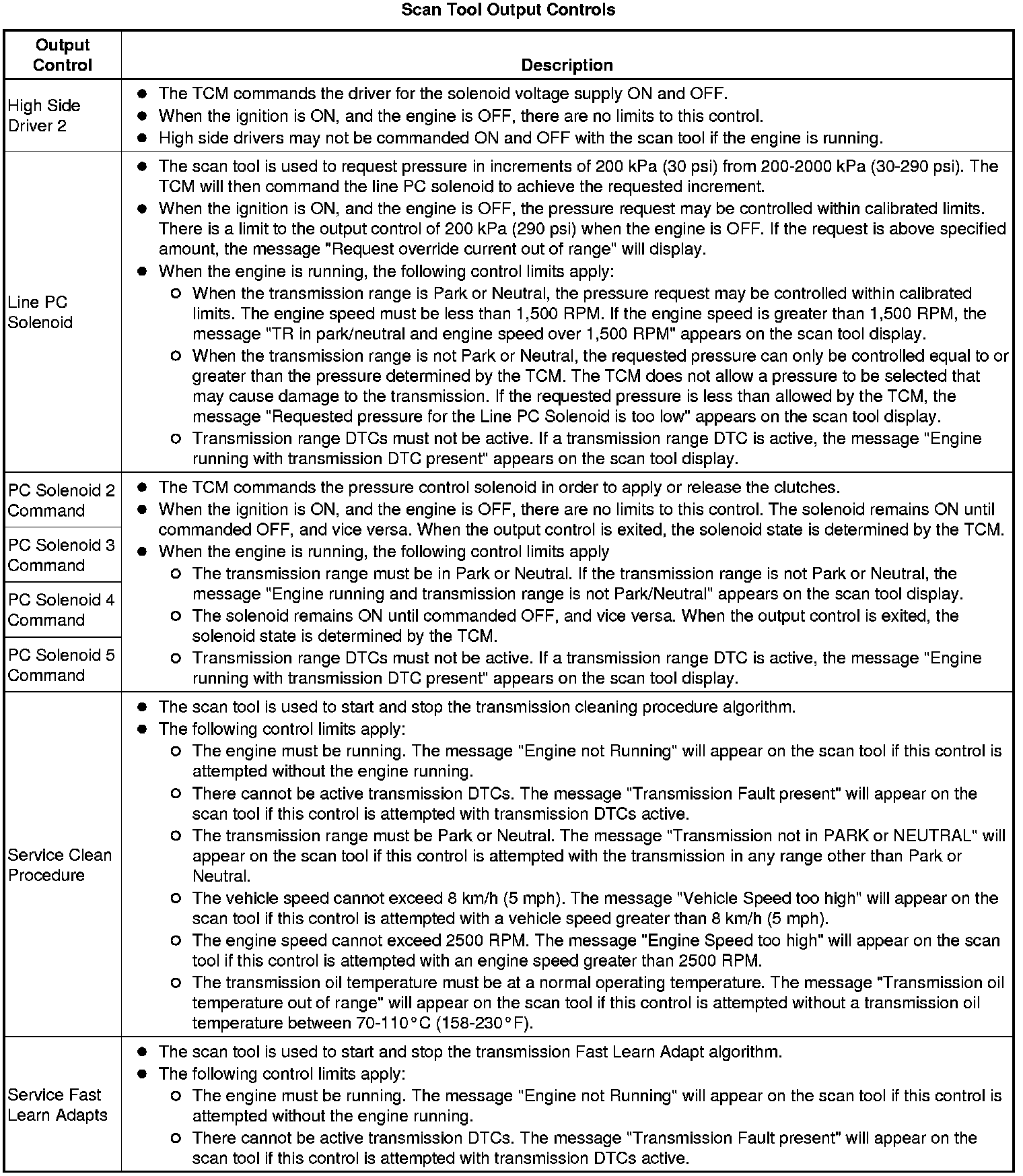 The Transmission Control Module Scan Tool Data List contains all transmission related parameters that are available on the scan tool. The list is arranged in alphabetical order. A given parameter may appear in any one of the data lists, and in some cases may appear more than once, or in more than one data list in order to group certain related parameters together.