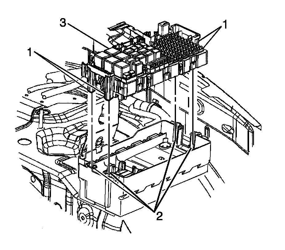 2. Install the junction block fuse holder by positioning the 4 locking tabs (1) to the retainers (2) at the base of the fuse block holder (3) and pressing into place until fully seated.