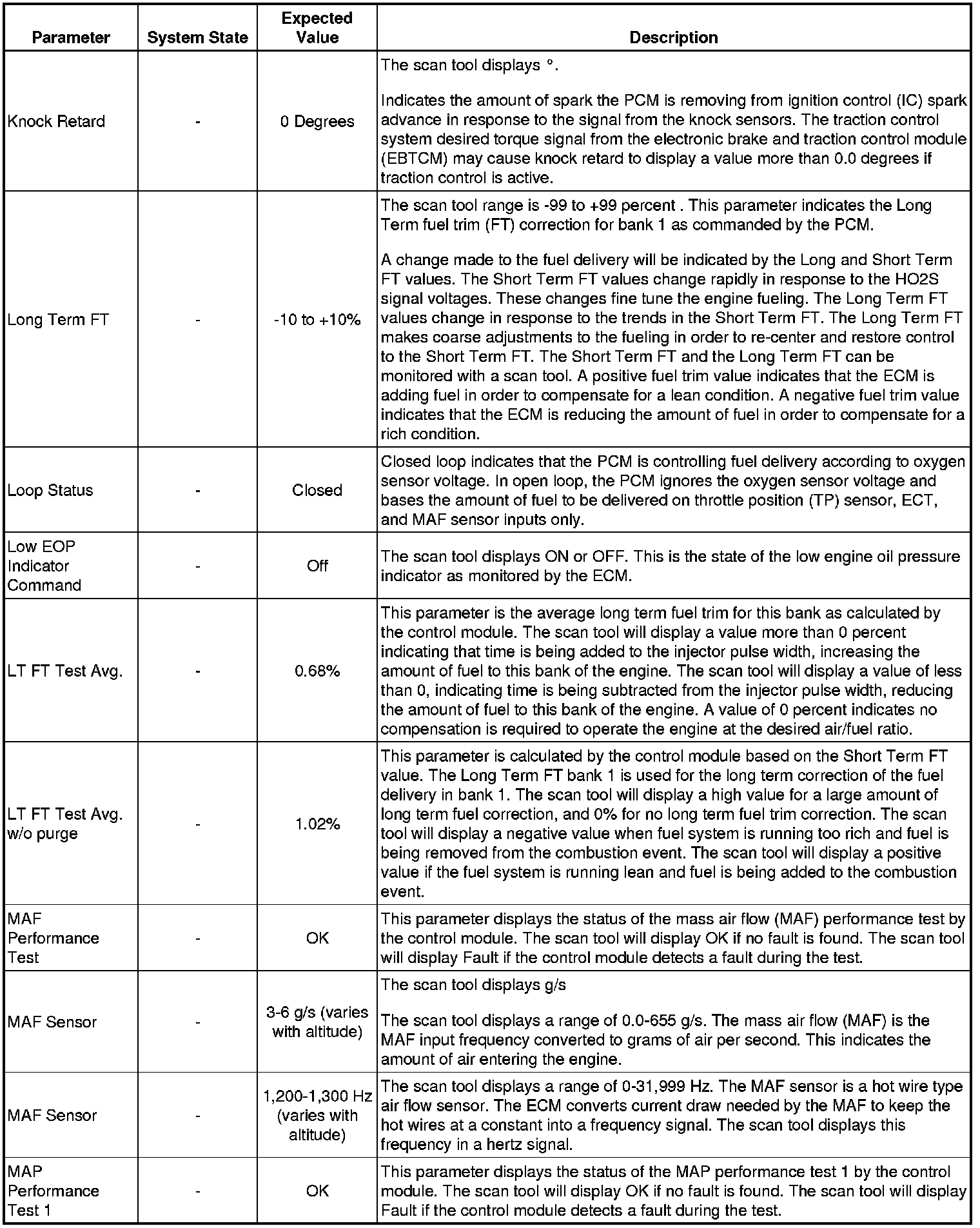 The scan tool values from a properly running engine may be used for comparison with the engine you are diagnosing. The Engine Scan Tool Data List represents values that would be seen on a normally running engine.