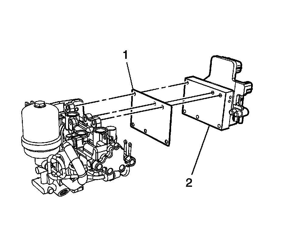 10. Carefully remove the BPMV gasket (1) and EBCM with BPMV assembly (2) from the brake master cylinder.
