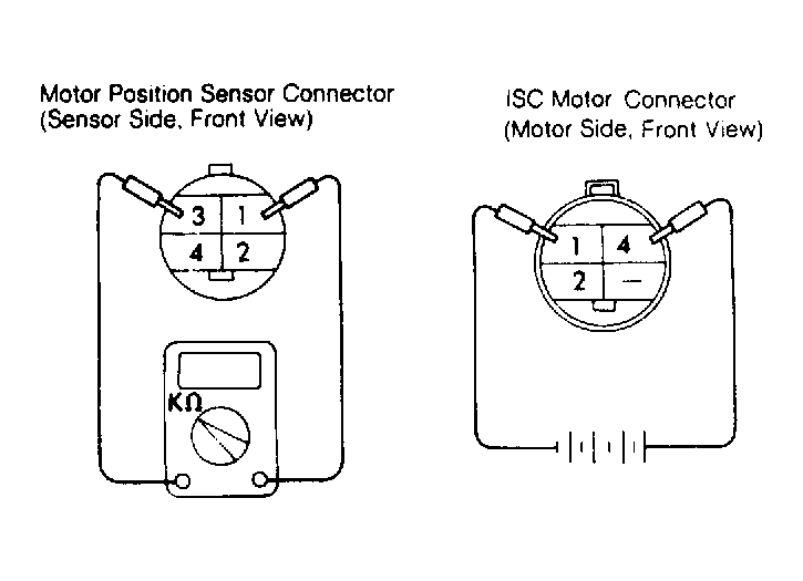 - Disconnect ISC motor connector. Check motor coil continuity between terminals No. 1 and 4. See Figure for terminal location. Resistance should be 5-35 ohms. If resistance is zero ohms or far more than specification, an open or short exists in motor coil. Replace ISC servo assembly.