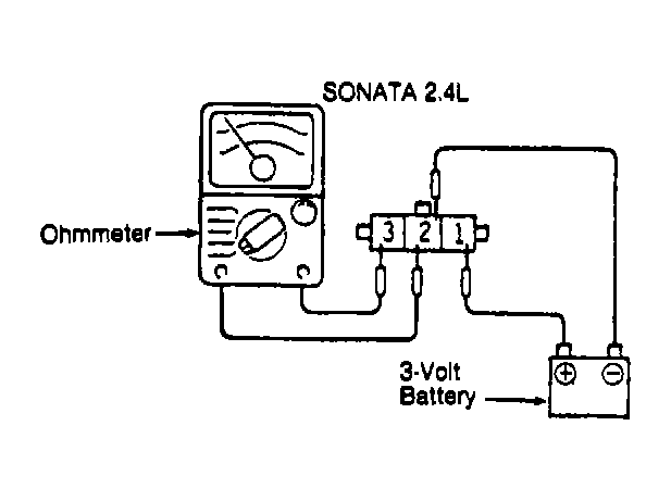1. Remove connector from power transistor. Apply 1.5 volts (3 volts on Sonata 2.4L) between power transistor terminals No. 1 and 2. See Fig 1 & Fig 2 .