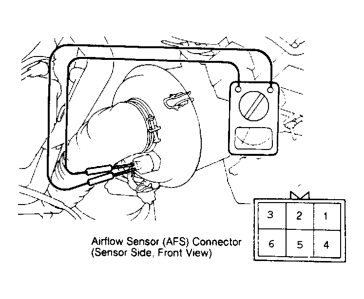 Measure voltage between terminals No. 3 (Green/White wire on 1.5L and 2.4L, Red/Green wire on 3.0L) and No. 6 (Brown wire) of airflow sensor connector. See Fig 1 . Warm engine to normal operating temperature and slow idle, while measuring voltage between terminals No. 3 and 6. With engine at idle and at 3000 RPM, 2.7-3.2 volts should be present. If voltage is not within specification, replace airflow sensor.