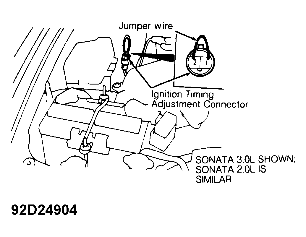 connect Hyundai's Multi-Use Tester (MUT) while adjusting timing on 3.0L engine, or incorrect basic ignition timing reading will result.