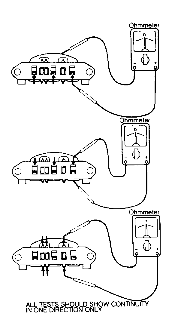 1. Check each diode with ohmmeter in both directions as indicated in illustration. See Fig 1. If diodes show high resistance in one direction and no resistance in the other direction, diodes are normal.
