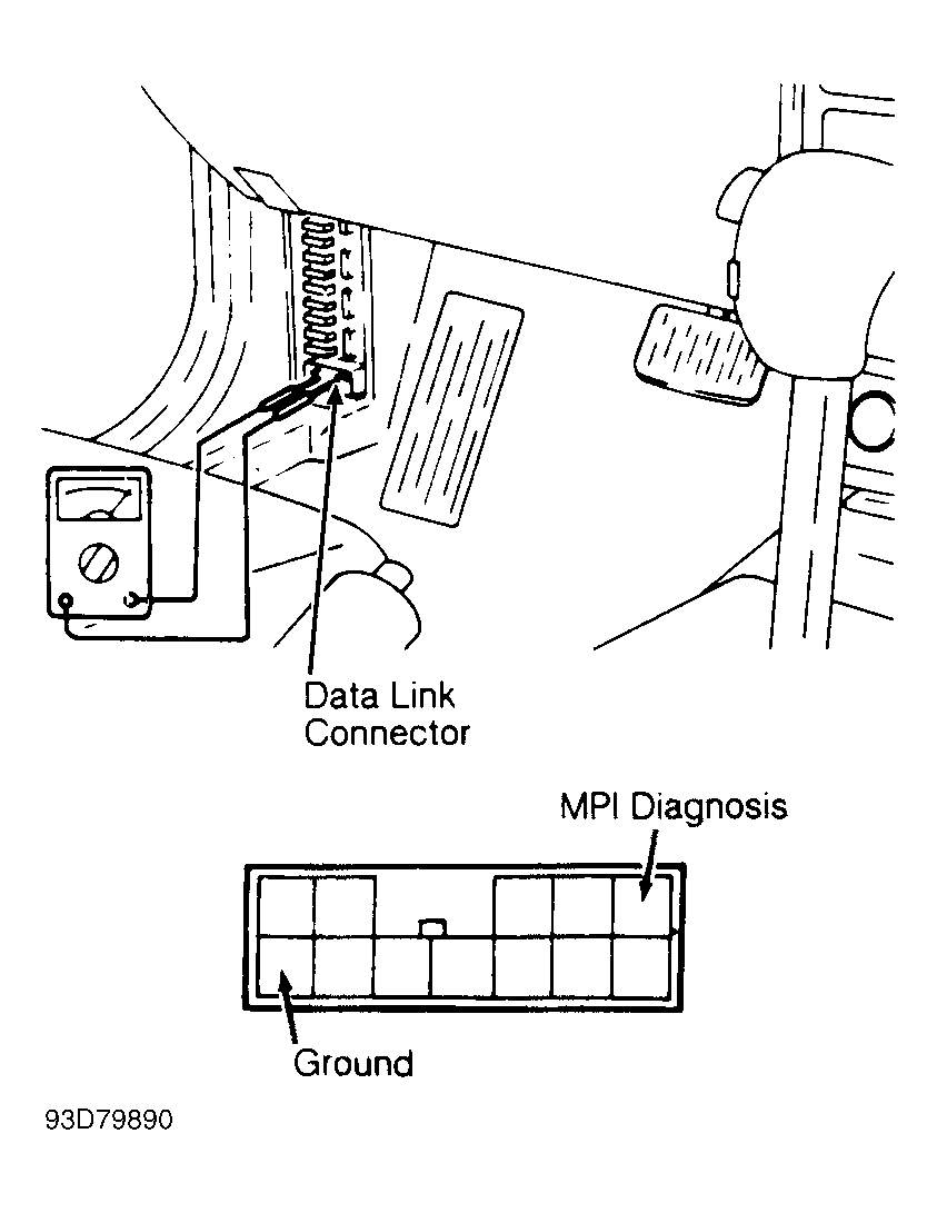 - Before entering on-board diagnostics, refer to SERVICE PRECAUTIONS. Turn ignition switch to OFF position. Locate Data Link Connector (DLC), next to fuse block. Connect voltmeter positive lead to Data Link Connector (DLC) MFI diagnosis terminal and negative lead to ground terminal. See Fig 1