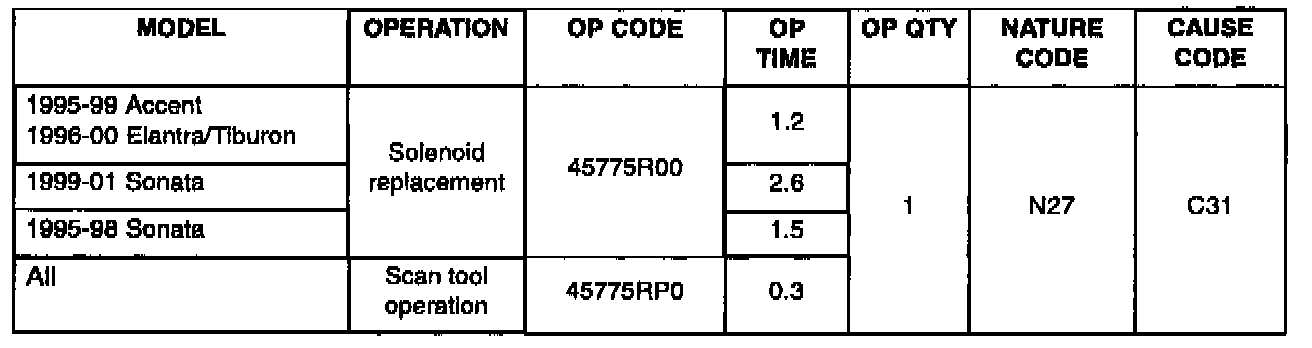 For 1999-2001 Sonata or 2001 Elantra, XG or Santa Fe, refer to the Automatic Transaxle Overhaul Manual, Page 45D-51, to locate the related solenoid.